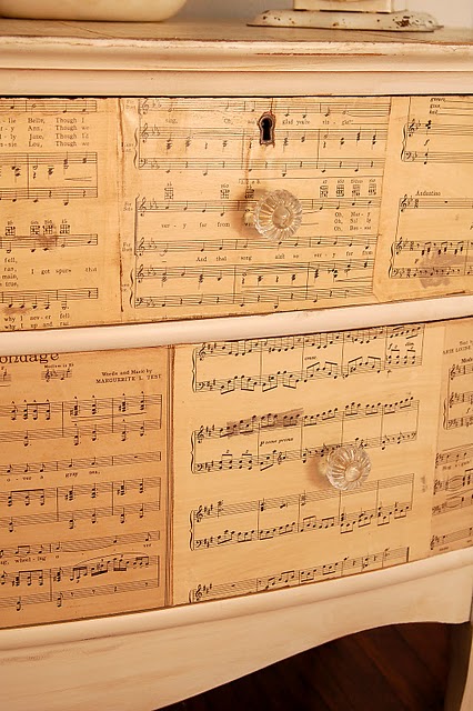 The veneer was chipped and bubbled and beyond her ability to repair. So, she decided to paint it and then cover it with antique sheet music. Isn't this a wonderful effect?
